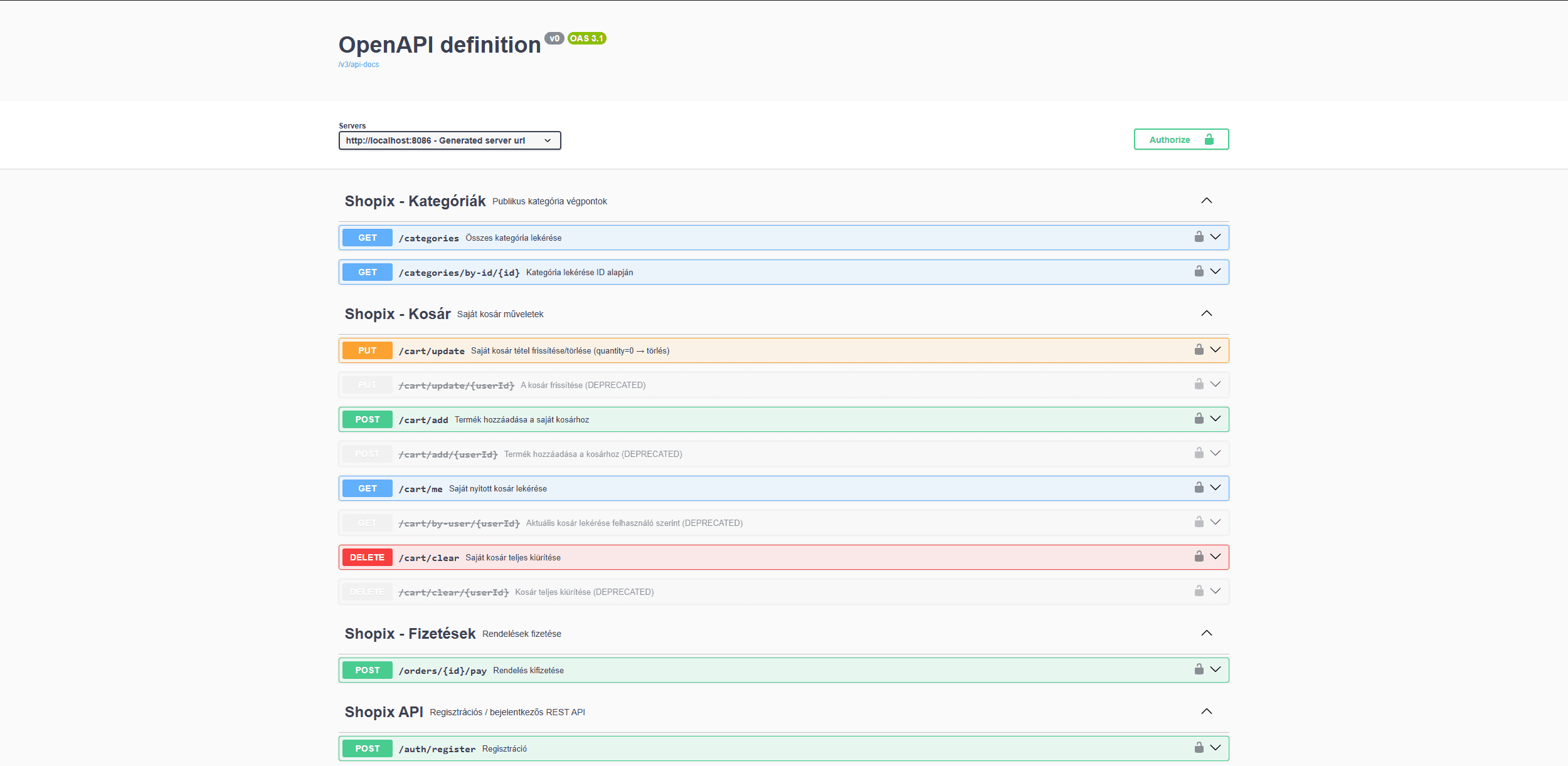 A Shopix egy Spring Boot alapú, REST architektúrát követő webshop backend rendszer. A fejlesztés során rétegzett felépítést alkalmaztam (Controller – Service – Repository), DTO mappinggel és validációval.