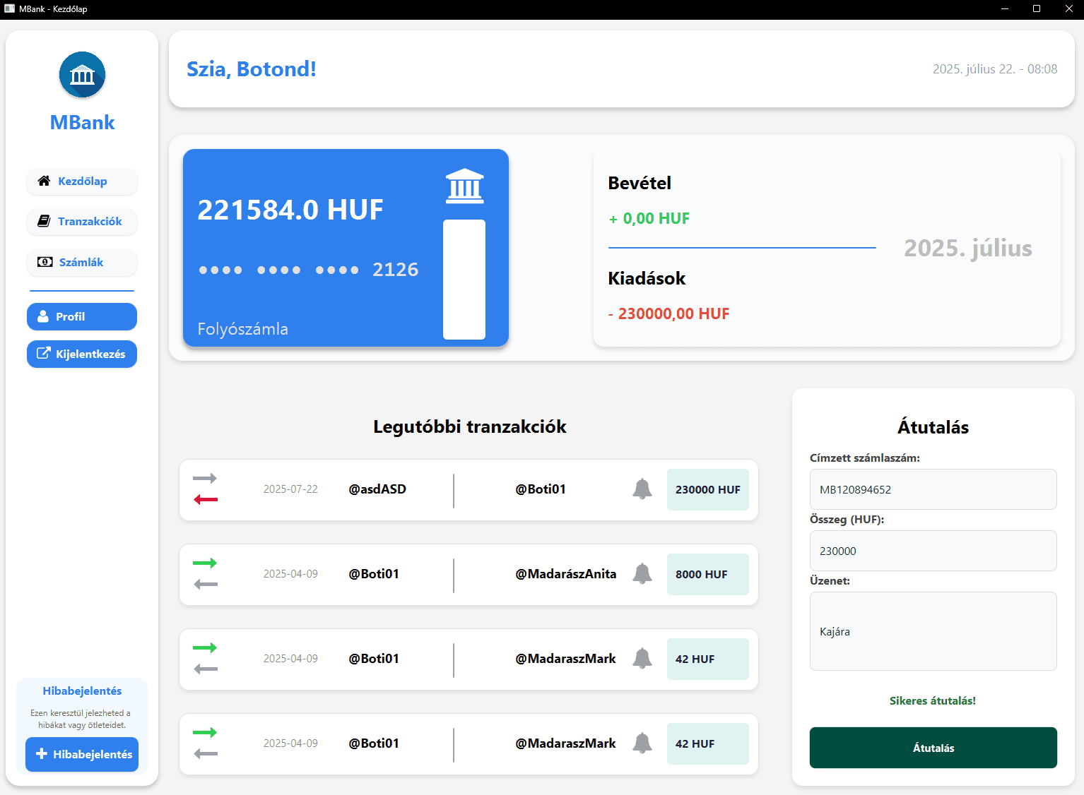 Az MBank egy JavaFX alapú internetbanki alkalmazás, amely lehetővé teszi a felhasználók számára pénzügyeik kezelését egy letisztult és reszponzív felületen keresztül.