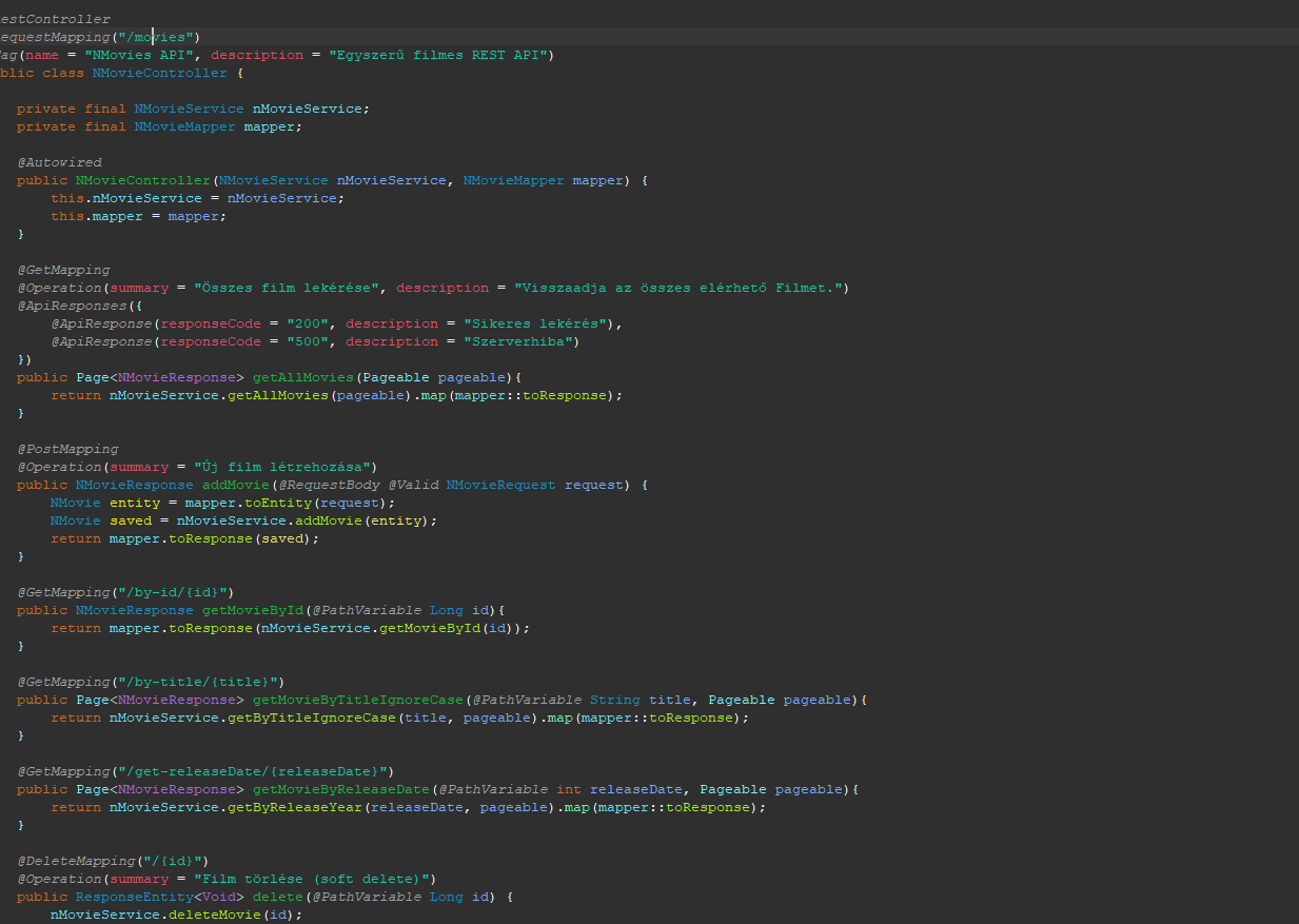 Az NMovie egy Spring Boot alapú filmes REST API, ami réteges architektúrára épül, és Spring Data JPA-t használ soft delete-tel, validációval és audit mezőkkel.